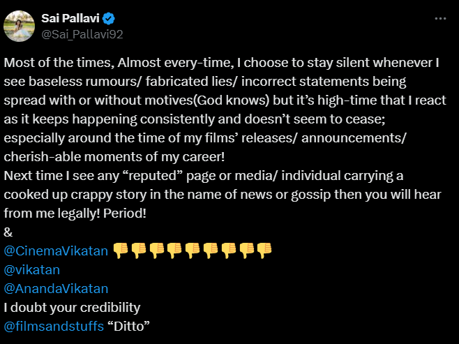 साई पल्लवी ने सोशल मीडिया प्लेटफॉर्म एक्स पर एक लंबा नोट लिखते हुए इसकी आलोचना भी की है। उन्होंने लिखा, ‘जब भी मैं सोशल मीडिया पर कोई गलत खबर देखती हूं, तो ज्यादातर मेरी कोशिश रहती है कि उसे नजर अंदाज करके चुप रहूं। लेकिन लगता है कि अब समय आ गया है कि मैं भी कुछ झूठी खबरों पर अपना रिएक्शन दूं, क्योंकि झूठ लगातार फैलाया जाता है और यह रुकता नहीं है। सबसे बड़ी बात यह है कि ऐसा अक्सर मेरी फिल्मों की रिलीज, घोषणाओं या मेरे करियर के यादगार पलों के आसपास होता है। तो, अगली बार जब मैं किसी फेमस पेज या मीडिया को ऐसा करते हुए देखूंगी, तो मुझे उनके खिलाफ कानूनी कार्रवाई करनी पड़ेगी।’